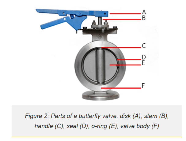 Принцип действия Поворотные затворы имеют относительно простую конструкцию. На рисунке 2 показаны основные компоненты дроссельной заслонки: корпус, уплотнение, диск и шток. Диск (рис. 2, обозначенный E) дроссельной заслонки выравнивается по центру подключенного трубопровода, а шток (рис. 2, обозначенный B) соединяется с приводом или ручкой на внешней стороне клапана. В закрытом положении диск перпендикулярен потоку, как показано на рисунке 2, и плотно прилегает к седлу клапана (на рисунке 2 отмечен D). Уплотнительное кольцо (рис. 2, обозначенное C) в уплотнении штока предотвращает утечку вдоль штока. Когда привод или ручка поворачивают шток дроссельной заслонки на 90°, диск также поворачивается на 90° и становится параллельным потоку. Частичное вращение позволяет дросселировать или пропорционально регулировать поток.