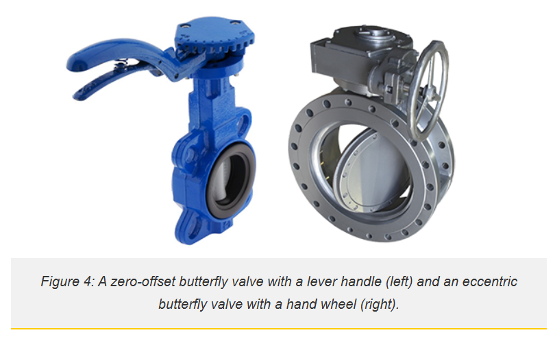 Типы дроссельных затворов Поворотные затворы бывают разных конструкций, каждая из которых предназначена для конкретного применения и диапазона давления. Поворотные затворы можно разделить на категории в зависимости от конструкции затвора диска, конструкции соединения и метода срабатывания. Конструкция затвора диска. Поворотные затворы могут быть концентрическими или эксцентричными в зависимости от расположения штока по отношению к центральной линии диска и угла поверхности седла клапана. Концентрическая Самая основная конструкция дроссельной заслонки — это центрическая или концентрическая дроссельная заслонка. Шток проходит через центральную линию диска, а седло представляет собой периферию внутреннего диаметра корпуса клапана (рис. 4 слева). Эта конструкция клапана с нулевым смещением известна как упругое седло, поскольку эффективное уплотнение зависит от гибкости резинового седла. При закрытии диск сначала соприкасается с седлом под углом около 85° при повороте на 90°. Концентрические дисковые затворы подходят для диапазонов низкого давления.